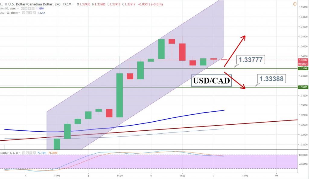 On the 4 hour chart, the USD/CAD has entered the overbought zone near $1.3370. The pair has formed a bearish engulfing pattern which is signaling a potential bearish reversal below $1.3370 today. Otherwise, the pair can continue to trade bullish above 1.3375