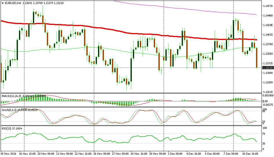 EUR/USD was retracing higher during the European session as we said, but it failed at resistance once again which comes at 1.14. The 100 SMA (red) also comes right there on the H4 chart. That moving average has been a solid resistance indicator, so it strengthened the resistance as well and EUR/USD reversed at 1.14 exactly. Now, this pair is around 80 pips lower.