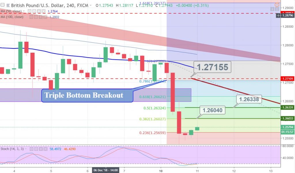 The cable dropped more than 200 pips to place a low at $1.2506, but it has formed a doji candle right after a strong bearish candle. Here, the doji candle has two meanings. Either sellers are exhausted and bulls are looming around $1.2550 or the sellers are taking a breath before placing more bets on the GBP/USD.