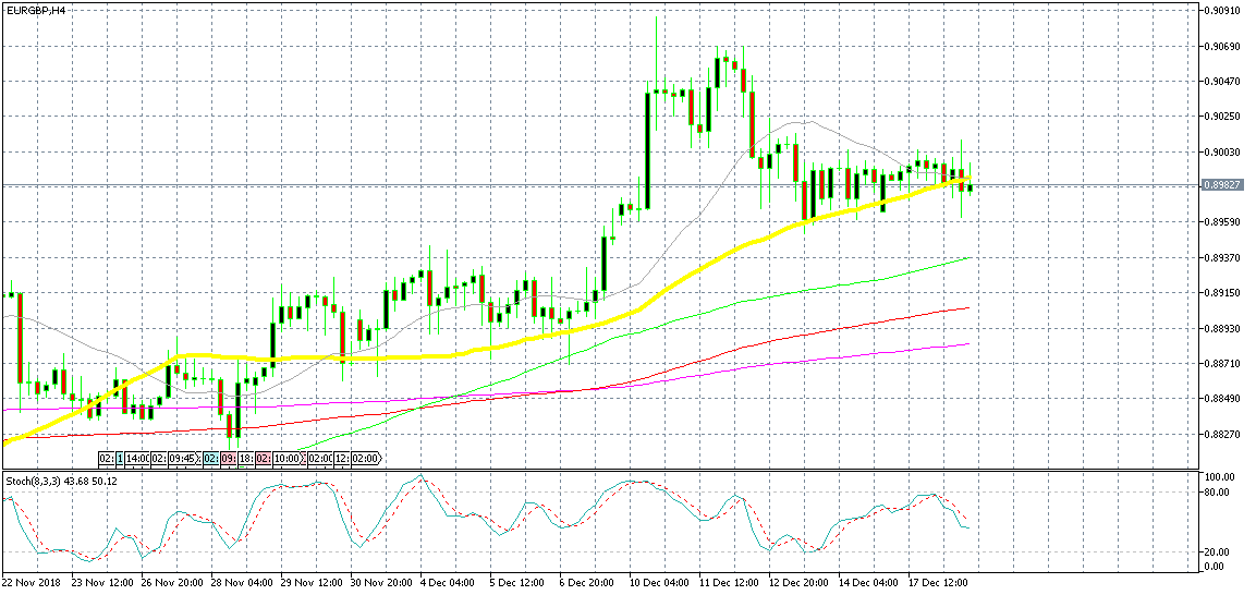 If we switch to the H4 chart, we can see that it has been the 50 SMA (yellow) which has been providing support to this pair since the middle of last week. The price as slipped below it but it’s not too far. It jumped above it a while ago and now it is back below. The 50 SMA has provided suport the week before that and before that it used to be resistance, so this is a strong indicator for EUR/GBP.