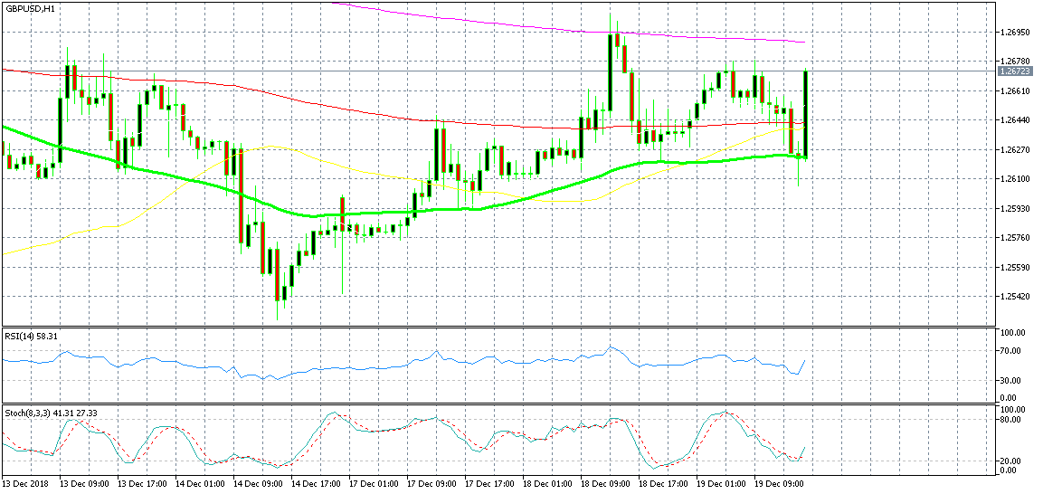 GBP/USD has turned bullish this week. This pair retraced lower during the European session but the 100 SMA (green) held its ground just like yesterday. The price formed a doji above it which is a reversing signal. The retrace lower was complete as stochastic got oversold so the reversing pattern was complete. Now, it has jumped around 50 pips higher.