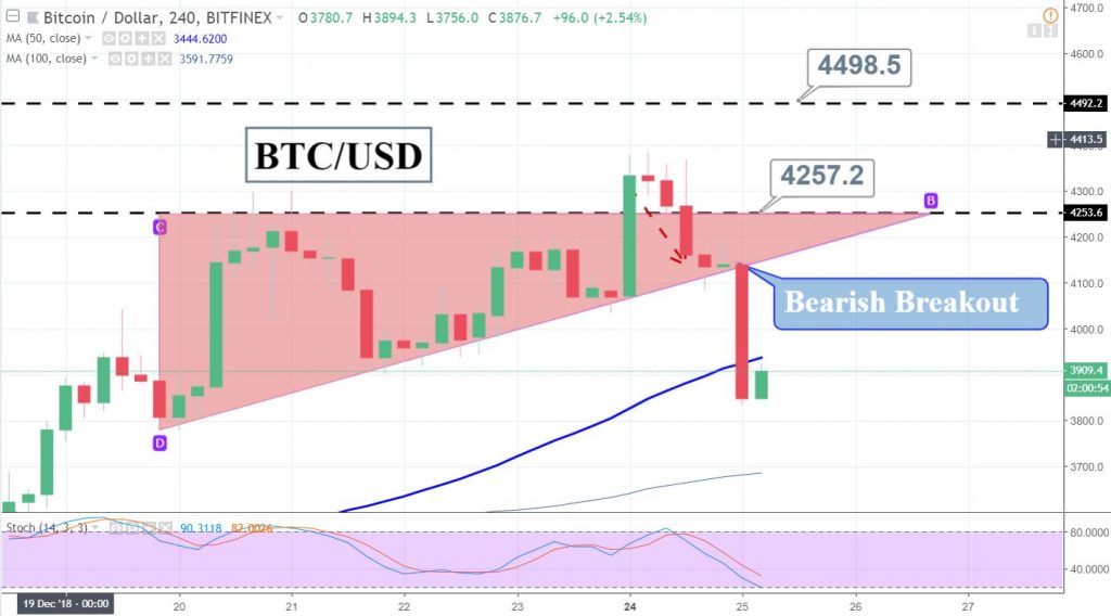 The leading cryptocurrency Bitcoin takes a sharp bearish turn to trade at $3,902.8, down by -459.3 points and -10.53% until now. As it can be seen on the 3 – hour chart, BTC/USD has a fakeout at $4,250, but the market reversed very soon on Christmas Day.