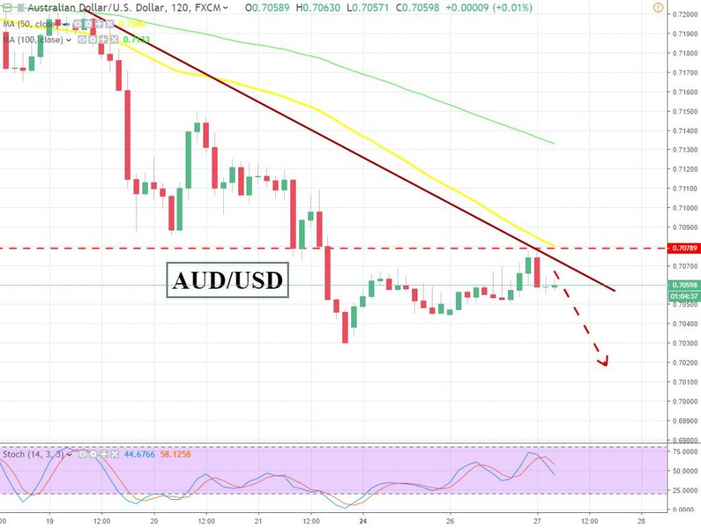 AUD/USD is looking bearish after breaking below the 0.7080 key support level. The pair has a bearish trend line and 50 periods EMA, which is pushing the commodity currency lower. We continue to prefer selling short on any pullback whilst price is contained under 0.7080 area.