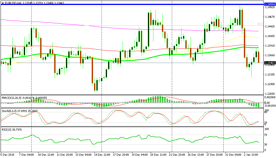But, they didn’t and EUR/USD reversed pretty quickly from 1.1380s. Switching to the H4 chart, we see that the price reversed at the 100 simple MA (green). The 100 smooth MA (red) was standing closely above it, so they would provide some strong resistance if the bullish momentum continued.