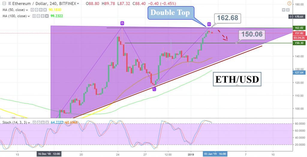 Ethereum has formed an ascending triangle pattern which usually signals a bullish trend, but at this point, the market is standing in the overbought zone. The double top pattern is providing a solid resistance at $163 level. The ETH/USD pair has closed a doji and shooting star candles below the resistance level and we may see sellers entering the market.