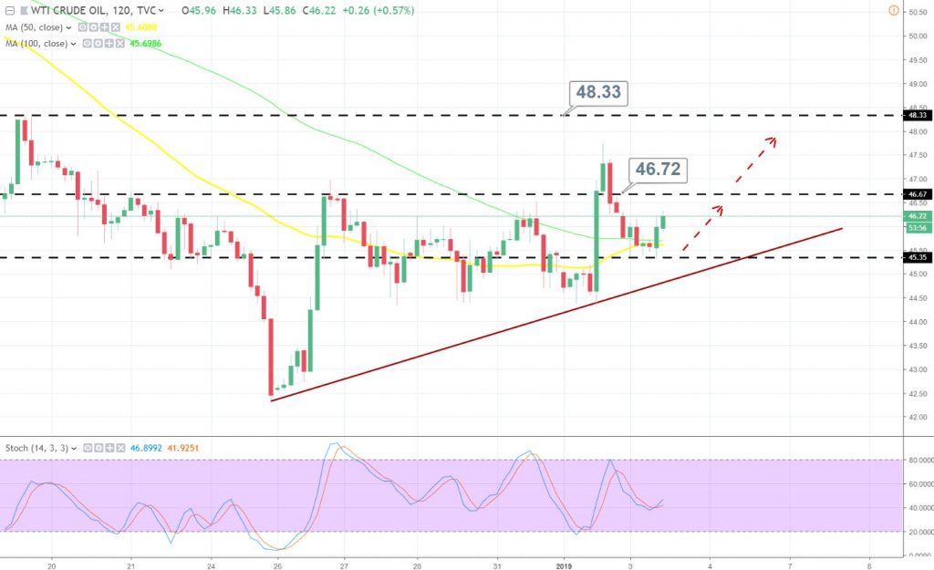 Now if we speak about the technical outlook, WTI is facing strong support around $45.30 while the resistance prevails around $46.75 and $47.45 today. So, the idea is to stay bullish above $45.30 with a stop loss below $44.90 and take profit near $46.75 today.