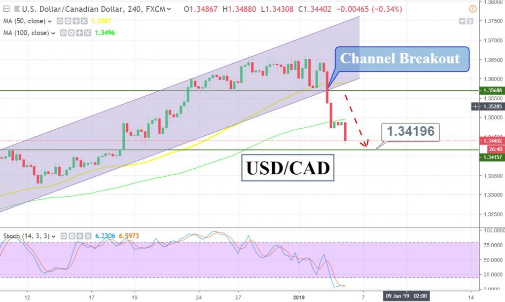 Technically, the USD/CAD has violated the bullish channel at $1.3570 and has also crossed below 50 and 100 periods EMA on the 4 – hour timeframe. The pair can gain support near $1.3400 today and the rest of the movement will be determined by the employment reports from the US and Canada during the New York session.