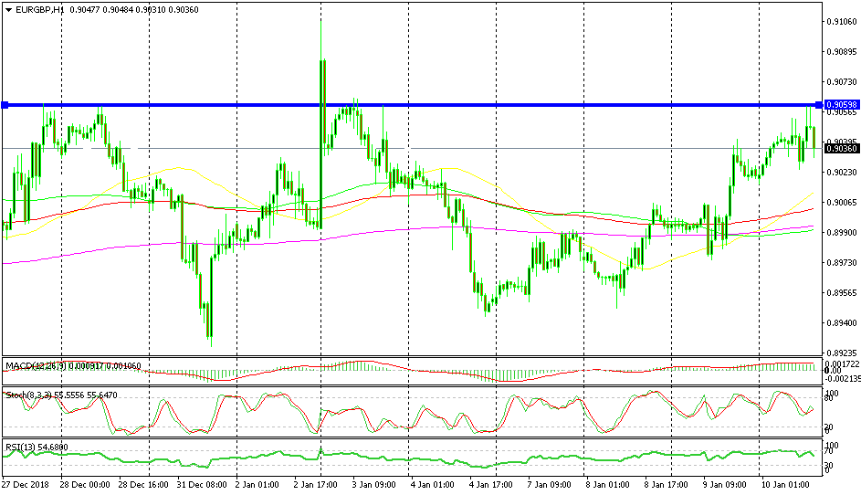 I was thinking about selling this pair at the resistance earlier on around 0.9060. But I held back as the GBP was tumbling lower on new general election talk from the Labour Party. But, technicals worked well again as thi pair is reversing down now. The resistance held well and the price formed an upside-down candlestick which is a reversing signal. The following candlestick is pretty bearish so the reversal is already underway.