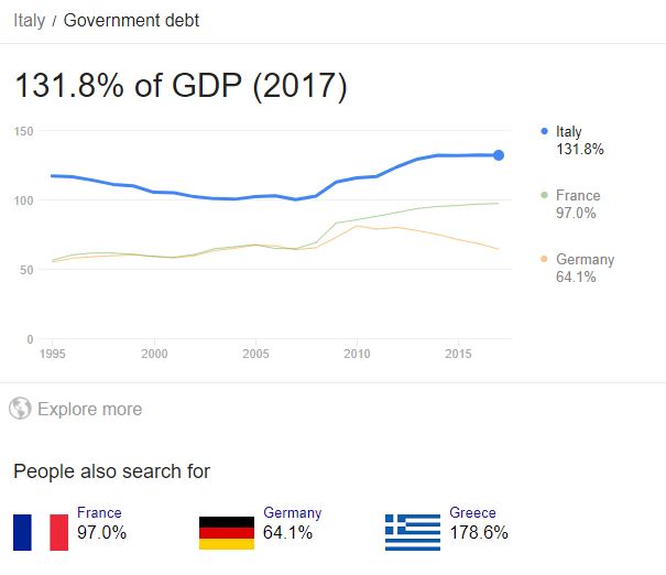 Italy is likely to enter a recession due to worsening Debt to GDP ratio. The figure has soared to 131.8% of GDP which is insane.