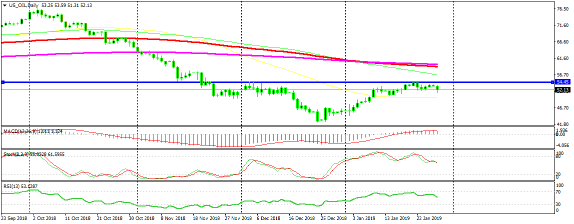 So, the range is in between the 100 SMA (red) at the bottom which comes at around $51.50 and the 200 SMA (purple) at the top, which comes at around $54.40-50. There’s a resistance area around the $54.50 level which has been providing resistance at the beginning of December when Oil was on the way down.