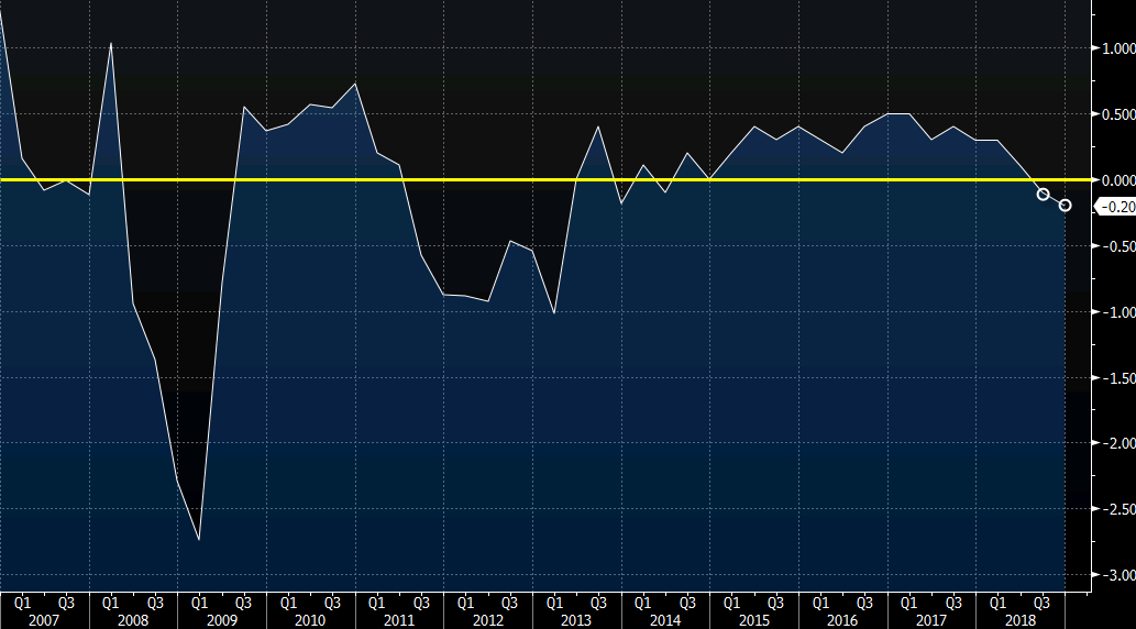 The GDP number for Q4 was expected to come negative at 0.1%, but it missed expectations, coming lower at -0.2%. The number for Q3 was also revised lower from 0.0% to -0.1%. This means that the Italian economy has been in contraction for two consecutive quarters.