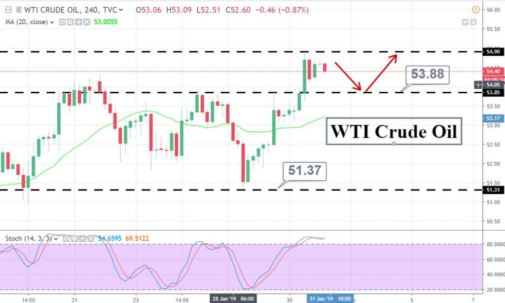 3) Thirdly, the technical side also played a big role. As we can see on the chart, crude oil managed to violate a sideways trading range of $53.90 – $51.30 to place a fresh high near $54.90.