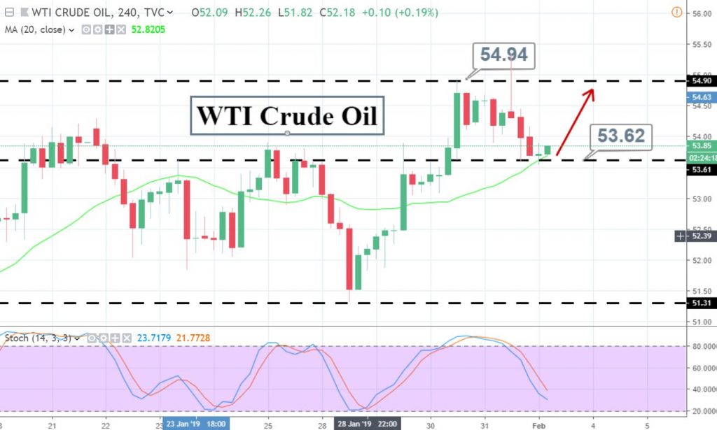 On January 30, crude oil managed to violate a sideways trading range of $53.90 – $51.30 to place a fresh high near $54.90. Crude oil seems to come out of an overbought trading zone after a series of fundamentals.