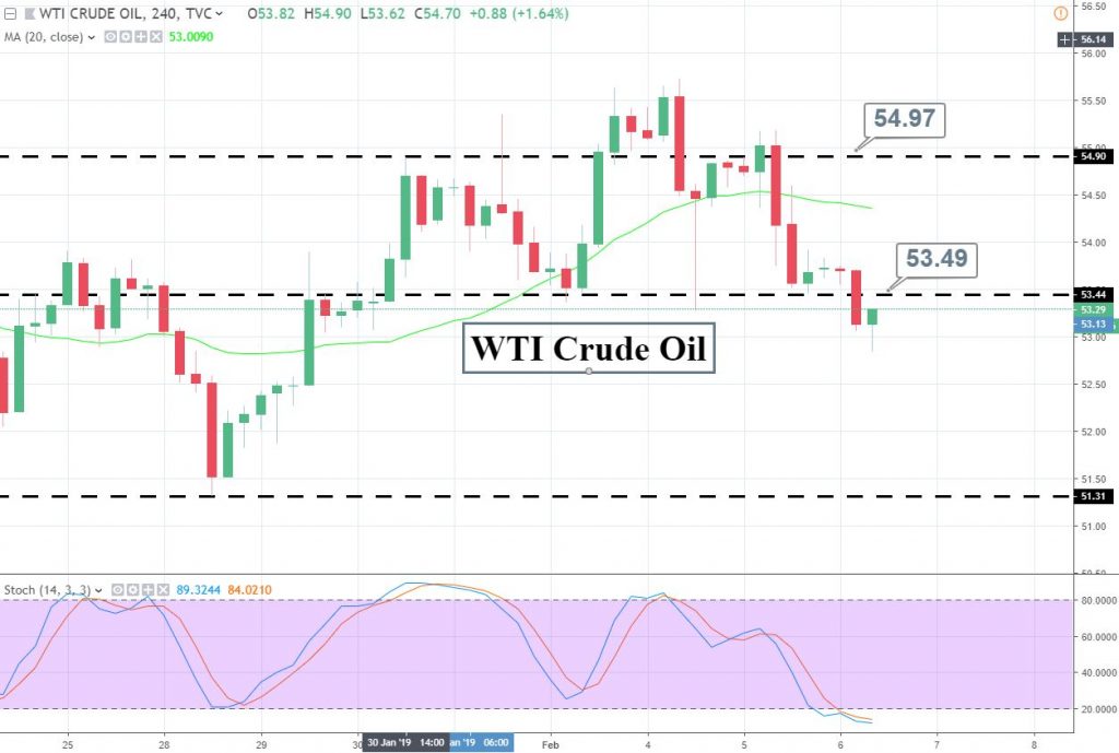 Technically, crude oil managed to violate a sideways trading range of $54.90 – $53.50 to place a fresh low near $53.10. Oil is closing candles below $53.50, confirming the breakout of this range. With this confirmation, investors may push oil prices further lower towards $52.50.