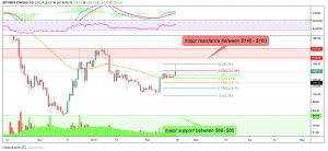 Ethereum is also quite bullish at the moment. The 50-day-EMA resistance was broken during this week and acted successfully as support since then. With ETH currently sitting at $130, it still has headroom of around 15 percent until it faces its next major resistance. While the MACD remains bullish, the RSI could soon reach overbought regions, indicating a correction wave in the not-too-distant future. If Ethereum falls below $116 in the short-term, it will most likely decline to its next major support between $68 and $85.
