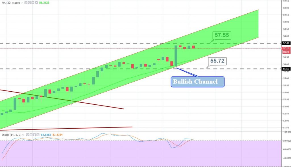 Consider staying bearish below $57.50 to target $56.60. While buying will be preferred above $57.50 to target $ 58.30.
