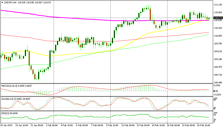 Just a while ago we closed our buy forex signal in USD/JPY as this pair bounced off the 200 SMA (purple) on the H4 chart. This moving average has been providing solid support during the second part of this week and the 50 SMA (yellow) has caught up as well and it is adding strength to the support. But, the USD lost around 20 pips after the Bloomberg announced a numbr of US companies to be targeted for retaliation on US Auto tariffs which has brought the price back down here again. I am thinking of going long again if the price touches the 200 SMA soon.