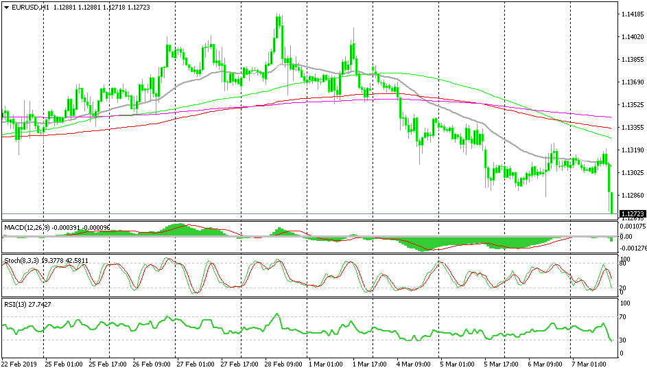 EUR/USD has been on a bearish trend since last week but it got stuck around the 1.13 level which has been providing support for some time. That level is now broken after the ECB accepted in the statement released a few minutes ago that they won’t be able to hike rates this year at all. Now, this pair is still slipping lower and I expect it to get even more dovish after the press conference from Draghi.