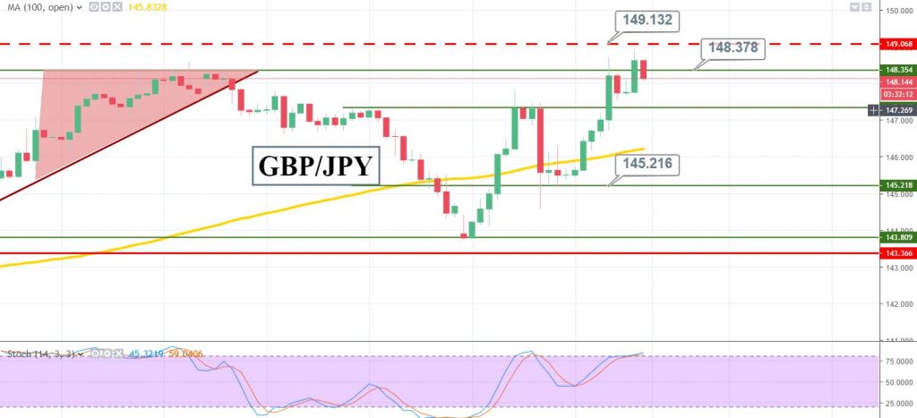 GBP/JPY is facing strong support around 147.200 along with resistance at 149. We can also see a 100 periods moving average crossover at 146