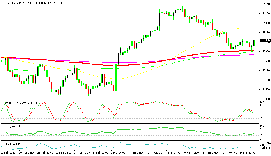 USD/CAD entered a bullish trend two weeks ago after trading in a range for several weeks. Although this week we saw a retrace down, the trend is still up since the pullback ended this morning way above previous lows. The price found support at the 100 SMA (red) this morning and formed a pin candlestick above it which is a reversing signal. The following candlestick looks quite bullish so the reverse is already underway.