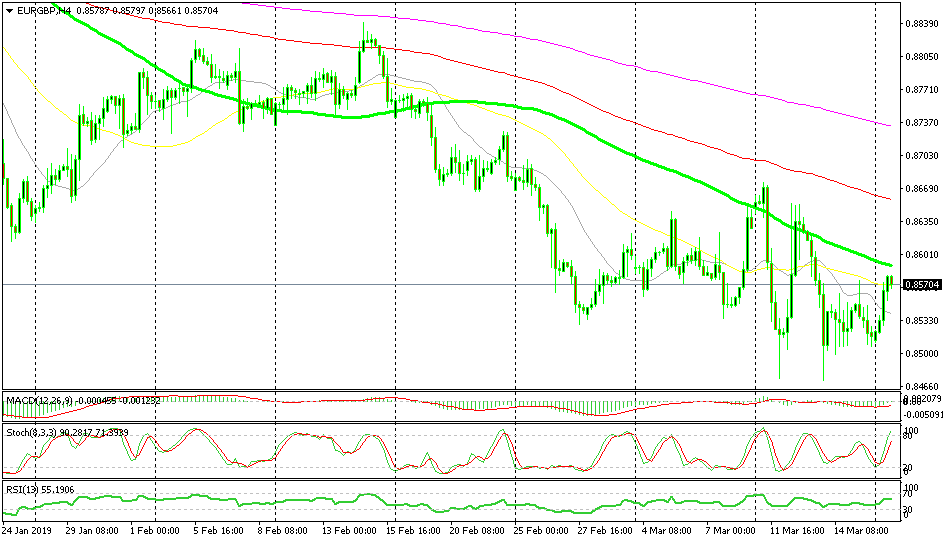 This pair turned bearish in the first week of February as odds of a hard Brexit diminished. The odds have increased again this month but the trend remains to be bearish. Today, this pair has climbed higher as EUR/USD continues to march higher stubbornly but the bullish retrace is complete now as the stochastic indicator shows on the H4 time-frame chart. If the buyers continue to push higher, the 100 SMA (green) will be waiting to provide resistance.