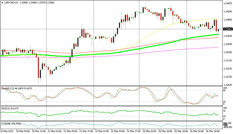 A while ago we went long on USD/CAD. This pair turned bearish last week when the USD was declining, but it has been forming a bullish trend in the last several days. We decided to go long on this pair today after the bearish retrace lower after th price became oversold on the H4 chart. USD/CAD moved higher after the pullback and at some point we were around 20 pips in profit on this trade, but the price dived back down, although the 100 SMA held its ground and now this pair is moving back up.