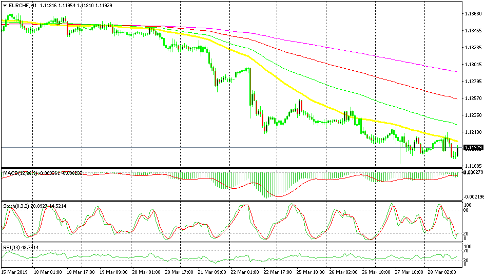 EUR/CHF turned bearish last week as the sentiment turned negative and, as a safe haven, the CHF attracted some strong bids together with the JPY. Since then, the trend has remained bearish and the 50 SMA (yellow) is defining it, as it keeps pushing the price lower. Right now EUR/CHF is retracing higher but the 50 SMA is waiting to provide resistance again, so we are getting ready to go short on this pair.