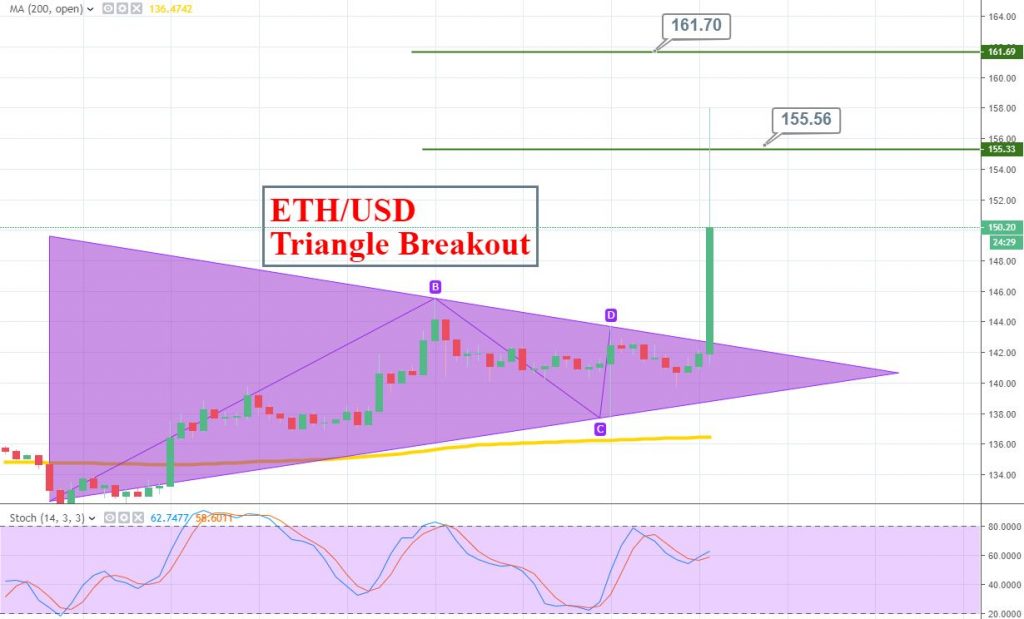 Besides BTC/USD which soared over 8%, the second most traded cryptocurrency pair ETH/USD cracked above the long-held resistance level of $142.