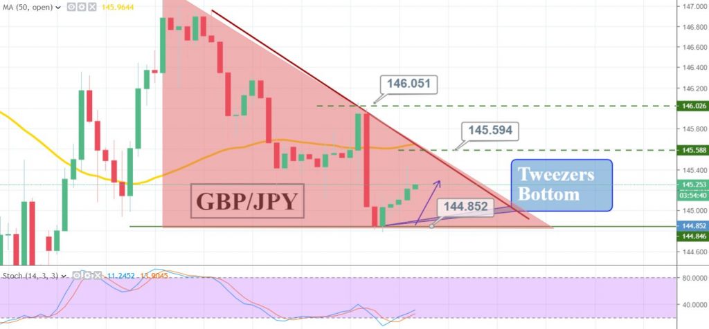 GBP/JPY has reversed after testing 144.850 support area and it’s very likely to face resistance around 145.600. Zooming in on the 4-hour chart, we can see that the pair has closed a tweezers bottom candlestick pattern which is signaling a bullish reversal in the market.