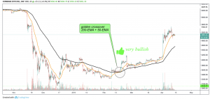 What’s very interesting is the fact that a golden crossover appeared in the H4 chart of Bitcoin at the price of roughly $3600. A golden crossover describes the event of the 50-EMA surpassing the 200-EMA and is considered very bullish. Additionally, the volume increased significantly during this current uptrend which is also very bullish.