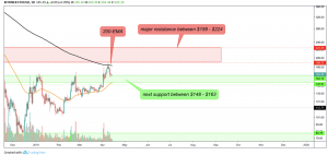 Ethereum was bearishly rejected by the 200-day-EMA and is currently in support region. Thus, Ethereum shouldn’t fall below the 50-day-EMA at $150 to remain bullish. For now, it seems likely that Ethereum will re-test the 200-day-EMA resistance in the upcoming weeks.