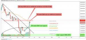 Once this happens in the daily chart, we can assume the end of the bear market. The EMAs will most likely touch each other when Bitcoin is heading towards the $6000 mark. Either the 50-day-EMA gets rejected by the 200-day-EMA or the market turns fully bullish again.