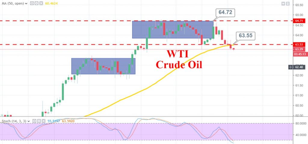 Today in the European trading session, the black crack, crude oil, is trading slightly bearish at $63.60, right below the major support cum resistance level of $63.65. The RSI is in favor of bearish trend along with the 50 periods EMA.