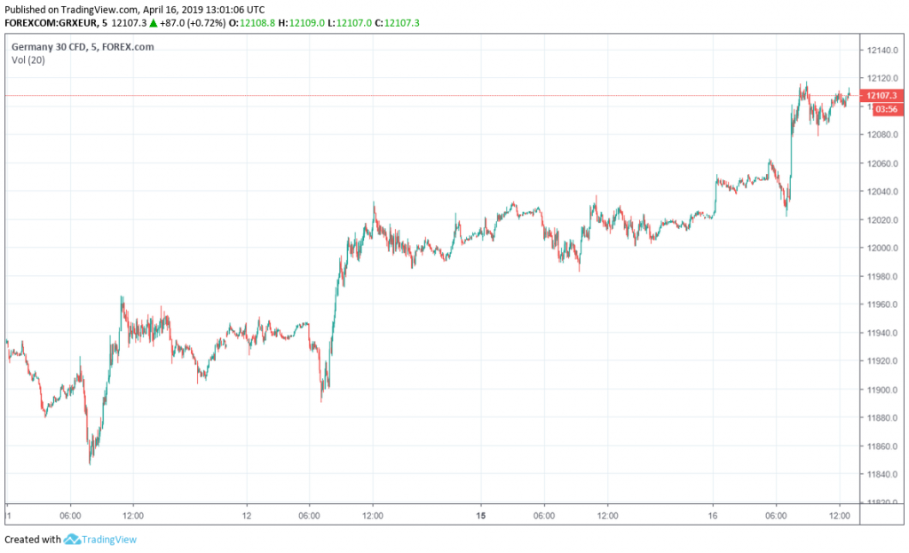 German index DAX rose by over 0.7% after the German economic sentiment marked an improvement for the sixth consecutive month. The improvement in market sentiment has also pushed UK’s FTSE up today.