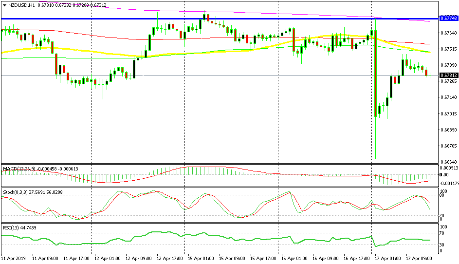 Earlier, we went short on NZD/USD as this pair was retracing higher after the 110 pip crash during the night as the Q1 CPI inflation report missed expectations of 0.3% and only showed a 0.1% increase. The Kiwi has been sort of soft compared to AUD/USD which continues to be on an uptrend and now the situation has reversed to bearish for NZD/USD after the inflation report. We saw a retrace higher during the Asian session but the retrace is complete now and moving averages are providing resistance above, so I think that we will be safe with this trade.