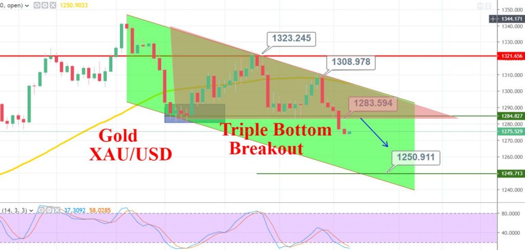 On the technical side, gold has violated the descending triangle pattern at 1,284. The closing of daily candle below 1,284 is adding to the bearish bias of traders. We may see further sell-off below this level.