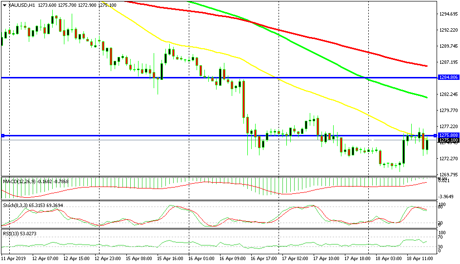 Earlier, we went short on Gold as the price was retracing higher after the negative manufacturing PMI from the Eurozone which hurt the sentiment. The main trend has shifted to bearish for Gold and the US retail sales report gave the USD a reason to rally and turned safe havens upside down. The retrace higher was also complete as stochastic shows. The previous support level has now turned into resistance at $1,275 and the 50 SMA (yellow) is also providing resistance, so it seems like a bearish reversing chart setup has formed in Gold now.