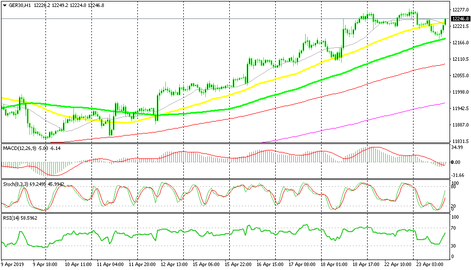 As I mentioned in a previous forex update, stock markets have been on a bullish trend all year so far, but today they retraced lower during the Asian and the European session as sentiment turned slightly negative. The 50 SMA (yellow) has been providing support for this index last week but today it was broken. Although, the 100 SMA (green) held its ground well and provided solid support. We went long from there and now Dax has reversed back to bullish. It has also broken back above the 50 SMA so the uptrend is back in place.