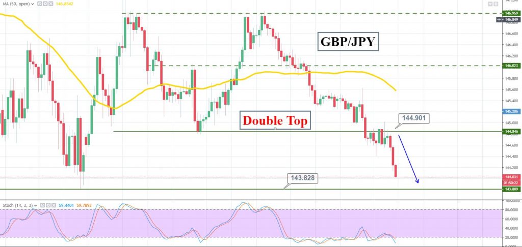 The last ‘Double Top’ pattern led to the current decline in the GBP/JPY, so all the Moving Averages have been violated. It’s likely that the market is going to continue falling in the short term towards the previously tested support at 143.83 – 143.71.