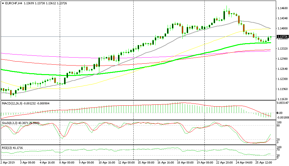 EUR/CHF has been on a bullish trend all this month after the SNB threatened with intervention at the beginning of April. Since then, this pair has climbed more than 300 pips and the 20 SMA (grey) has been providing support during this time. But it was broken this week as EUR/CHF retraced lower and the retrace seems complete now. The price also found support at the 100 SMA (green) on the H4 time-frame chart and is bouncing higher off it.