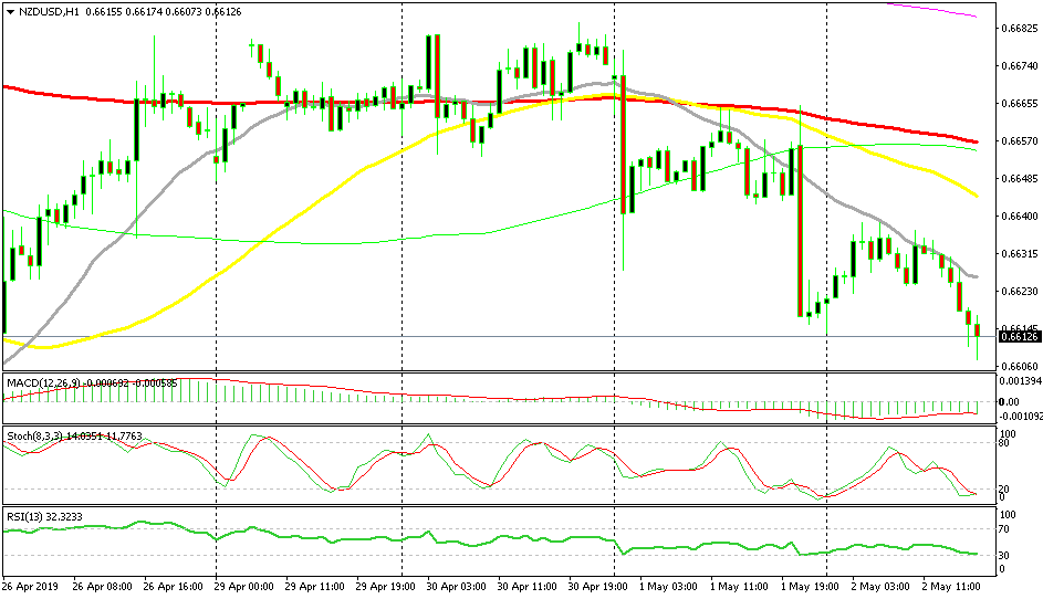 NZD/USD has been on a bearish trend since March. but we saw this pair retrace higher during the second half of last week. The retrace was complete yesterday when the Asian session started after the soft employment report from New Zealand. This pair lost around 50 pips after that and it took another hit after Powell’s press conference. It made a small retrace higher during the Asian session today but the sellers returned once the 20 SMA (grey) caught up with the price. So, everything is pointing down for this pair.