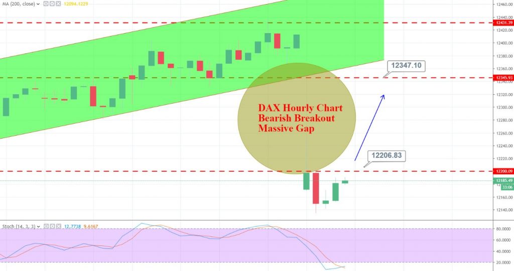 During the European session, the DAX index has fallen dramatically on Risk-off sentiment. Currently, the DAX is at 12,168, down 1.98% on the day.