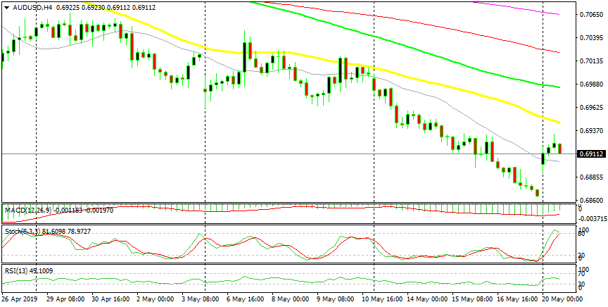 AUD/USD has been pretty bearish in the last several weeks and it continues to be bearish as the sentiment deteriorates ober China-US trade war escalation. The market is expecting the Reserve bank of Australia to cut interest rates after the central bank of New Zealand did so two weeks ago. But we saw a bullish pull last night and a bullish retrace higher, which is now complete as stochastic shows. This pair is overbought on the H4 chart now and it is reversing down, so we are thinking of going short on it soon.