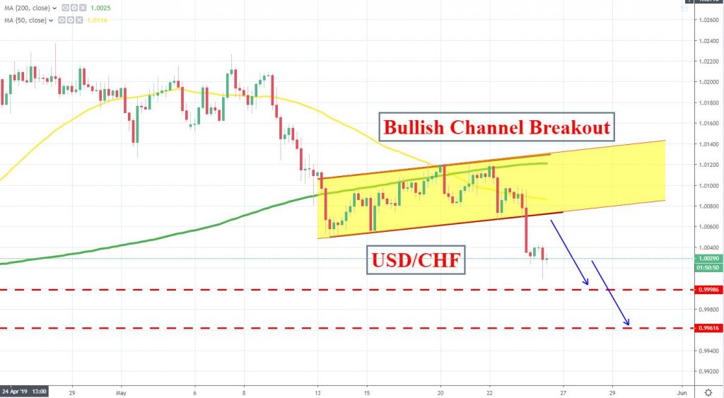 USD/CHF is one of the victims today. The USD has been a safe haven currency when it comes to the US-Sino trade war. Nevertheless, the scenario has changed: now traders worry that the trade dispute will burn the American economy more than presumed, thereby boosting bets for the Federal Reserve’s rate cut this year.