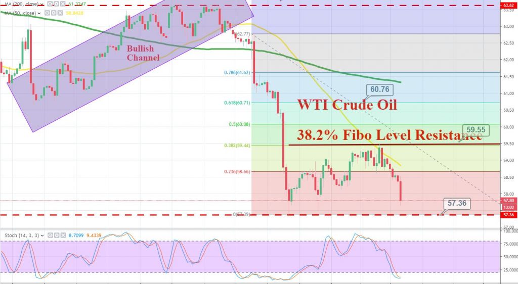 On the technical side, crude oil is trading sharply bearish after violating the $58.50 support area, which is now working as a resistance. On the lower side, crude oil is facing support of around $57.30. Crude oil can continue selling trend until $56.60 on the violation of $57.30 today. For now, let’s keep an eye on $57.30 as the market has good potential to reverse above this level.