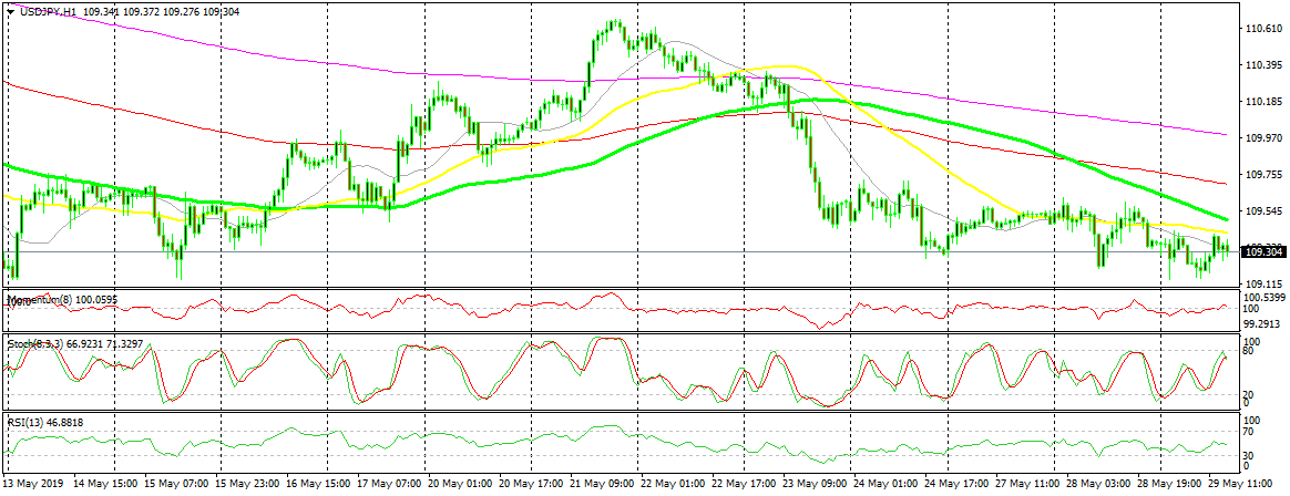 USD/JPY has turned bearish this month as the sentiment keeps deteriorating on escalating trade war which helps safe havens like the JPY. The downtrend has slowed this week but the moving averages are coming down and they are pushing this pair lower. In the last few hours we have seen a retrace higher on the H1 chart, but the retrace is complete as the stochastic indicator shows, so a bearish reversal is expected.