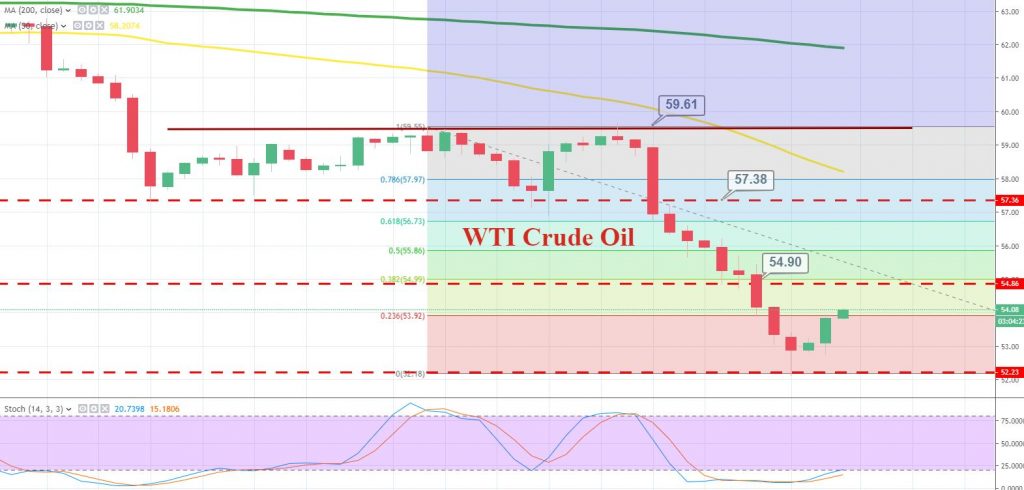 With that in mind, we drew a Fibonacci retracement indicator from 59.60 to 52.24 low. The indicator is suggesting a bullish target of 53.92 and 54.99, helping us secure first take profit at 53.90. For now, I would wait a bit before entering another buying position in crude oil.