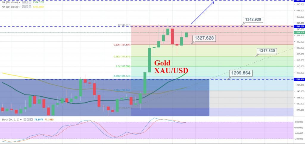 Gold traded sideways during the early Asian trade, keeping a narrow trading range of $1,335 – $1,329. The US- China trade tensions and sentiments of an interest rate cut by the Federal Reserve seem to underpin gold prices today. Let’s now discuss two reasons behind the bullish trend in gold.
