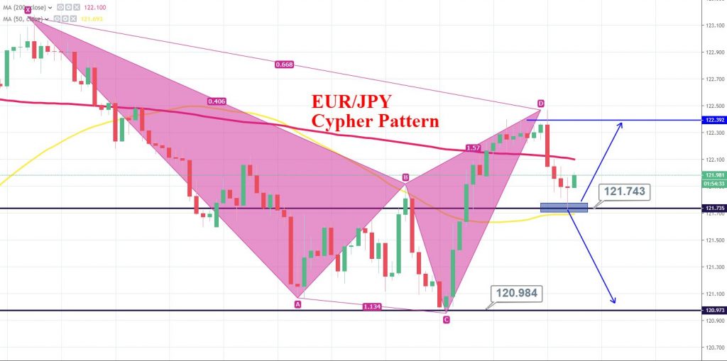 So far, EUR/JPY has dropped over 0.26% to trade at 121.950, but I wanted to draw your attention towards Cypher pattern on 3- hour chart. The pattern has completed C to D wave around 122.300 and has started pushing EUR/JPY lower. Typically this kind of pattern drives strong bearish moves, which is why EUR/JPY has dropped to 121.750 support area.