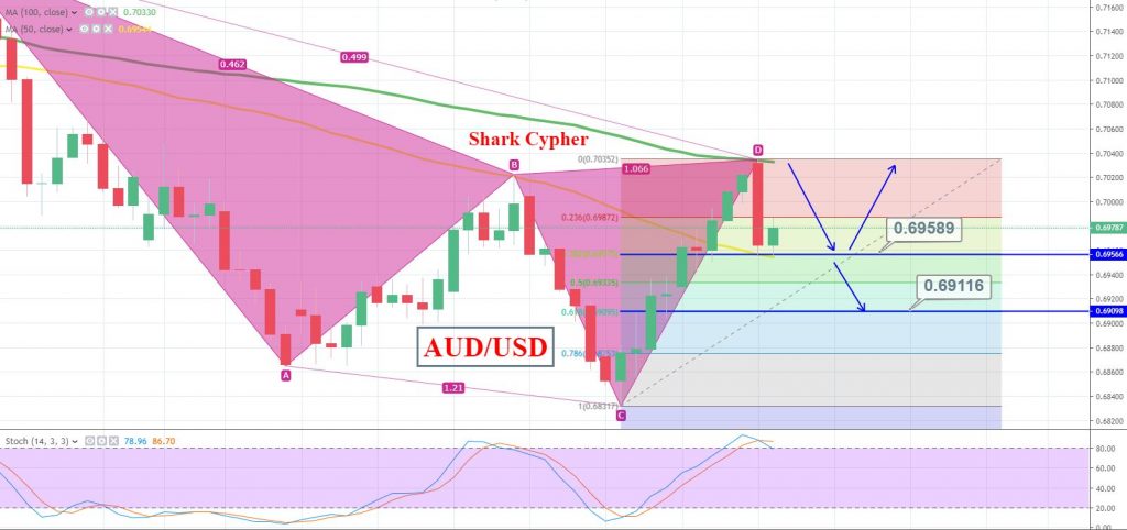 AUD/USD has formed a bearish setup called Shark Cypher on the daily timeframe, completing CD wave from 0.6840 to 0.7040. Aussie has already completed the 38.2% Fibonacci retracement around 0.956, and now this level is providing substantial support to AUD/USD.